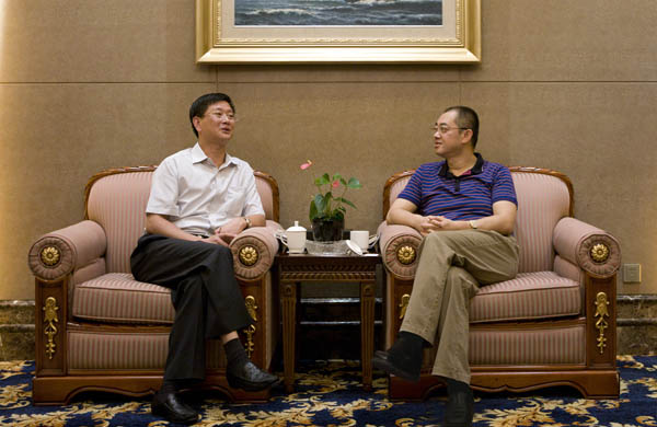 夏海鈞總裁與江西省鷹潭市常務(wù)副市長宋迪維(左)親切交談