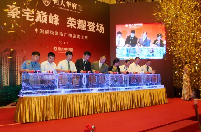 領(lǐng)導嘉賓為冰雕注入紅酒,正式啟動“中國頂級豪宅廣州鑒賞之旅”活動?