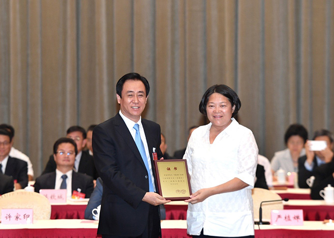 廣東省委常委、統(tǒng)戰(zhàn)部部長嚴(yán)植嬋向許主席頒發(fā)證書