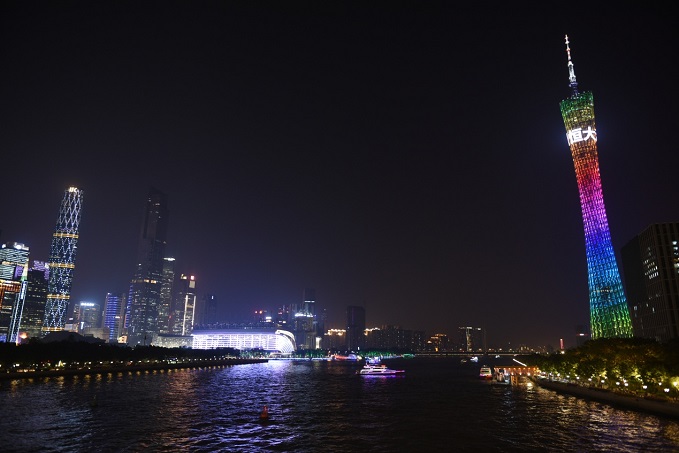 10月23日晚,廣州市政府在廣州塔亮燈,再次“熱烈祝賀廣州恒大淘寶足球隊(duì)中超七連冠”。