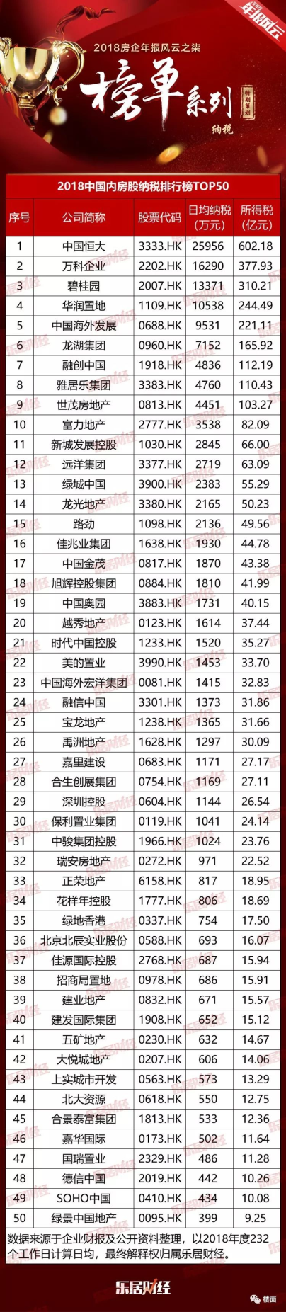 在樂居財經(jīng)推出的所得稅排行榜中,中國恒大憑借602.18億的所得稅排名第一,成為內(nèi)房股的所得稅“納稅王”,日均納稅2.6億;萬科、碧桂園所得稅分別為377.93億和310.21億,位列第二和第三;華潤置地、中國海外發(fā)展、龍湖集團、融創(chuàng)中國、雅居樂集團、世茂房地產(chǎn)和富力集團,分別排第四至第十名。