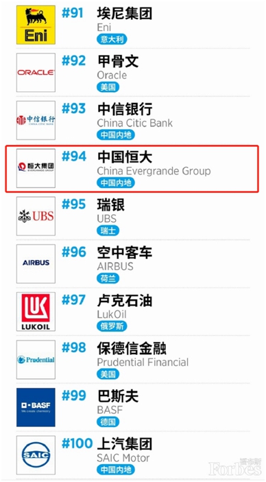 5月16日,福布斯發(fā)布全球企業(yè)2000強(qiáng)排行榜,中國(guó)恒大位列榜單第94位。