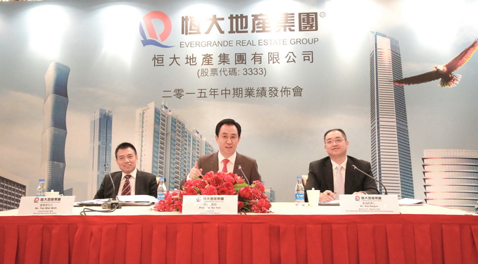 2015年中期業(yè)績發(fā)布會現(xiàn)場,中為董事局主席許家印,右為董事局副主席、總裁夏海鈞,左為首席財務官兼執(zhí)行董事謝惠華