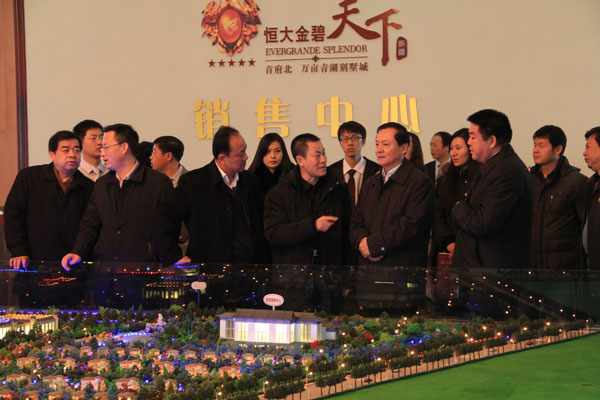 1月17日下午,新疆生產(chǎn)建設(shè)兵團(tuán)司令員劉新齊、農(nóng)六師政委馬新平、師長(zhǎng)張順幫等領(lǐng)導(dǎo)一行,來(lái)到我司投資203億建設(shè)的位于五家渠市的恒大金碧天下銷售現(xiàn)場(chǎng)進(jìn)行考察并調(diào)研。