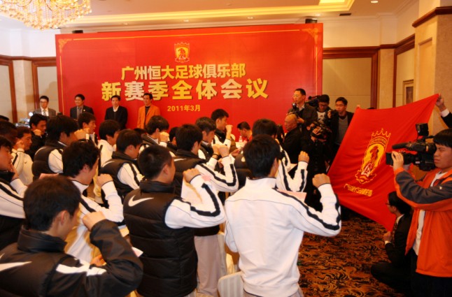 3月18日,廣州恒大足球俱樂(lè)部新賽季全體會(huì)議在廣州恒大酒店順利舉行,集團(tuán)董事局主席許家印教授、廣州市體育局副局長(zhǎng)孔茂勝、集團(tuán)副總裁兼廣州恒大足球俱樂(lè)部董事長(zhǎng)劉永灼、廣州恒大足球俱樂(lè)部全體教練員和運(yùn)動(dòng)員出席會(huì)議。會(huì)議宣布了《關(guān)于同意<廣州恒大足球俱樂(lè)部2011賽季聯(lián)賽獎(jiǎng)金方案請(qǐng)示>的批復(fù)》、《廣州恒大足球隊(duì)“五必須、五不準(zhǔn)、五開(kāi)除”管理規(guī)定》等重要文件。會(huì)議期間,廣州恒大足球俱樂(lè)部全體教練員和運(yùn)動(dòng)員進(jìn)行了賽前誓師活動(dòng)。