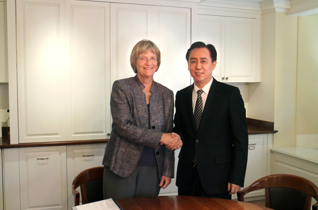 哈佛校長(zhǎng)福斯特(左)與許家印教授達(dá)成共識(shí)