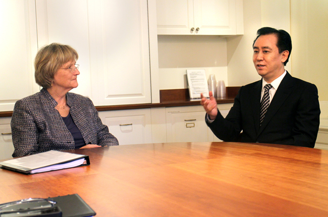 哈佛校長(zhǎng)福斯特(左)與許家印教授會(huì)談