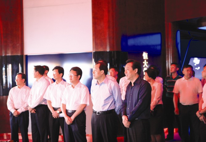 集團(tuán)董事局主席許家印陪同黑龍江代省長陸昊(前排右二)等省市領(lǐng)導(dǎo)考察集團(tuán)展廳