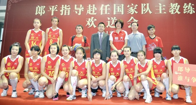 廣東省體育局副局長甘焯雄、廣東恒大排球俱樂部董事長劉永灼與俱樂部隊員、球迷代表一起歡送郎平指導(dǎo)赴任國家隊主教練