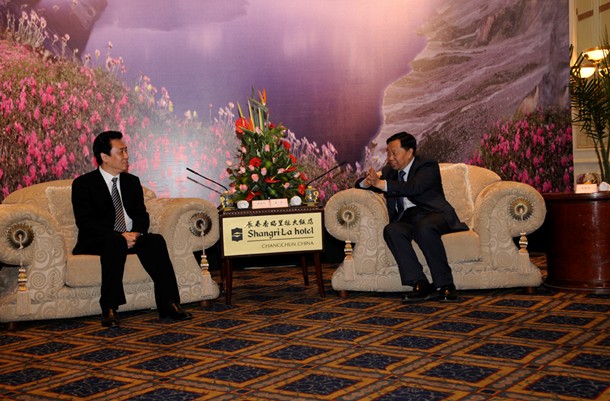 圖為許家?。ㄗ螅┡c吉林省省長王儒林親切交流